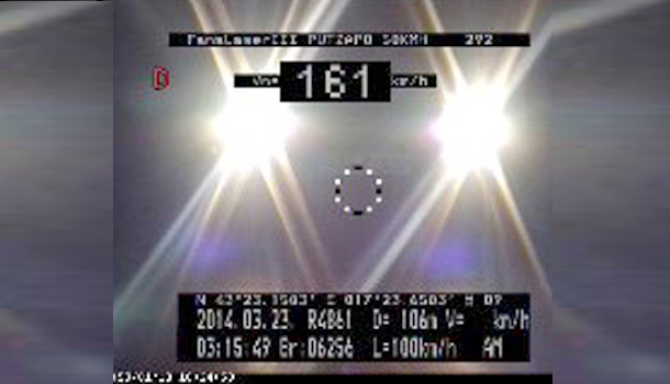 U mjestu Gornji Zorići, na dijelu ceste na kome je brzima ograničena na 50 km/h, navedeno vozilo kretalo je se brzinom od 161 km/h, što je snimljeno radarom marke FAMA LASER III koji ima mogućnost noćnog snimanja, a može ga se postaviti i u vozilo.