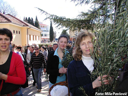 Uz navještaj evanđeoskog ulomka o Gospodinovu ulasku u Jeruzalem, tamo su međugorski svećenici fra Tomislav Pervan i fra Vjekoslav Milićević na svečan način obavili obred blagoslova maslinovih i palminih grančica uzdignutih u rukama vjerničkog puka. Tim simboličkim činom katolički vjernici još su se jednom podsjetili na Kristov mesijanski i pobjedonosni ulazak u Jeruzalem.