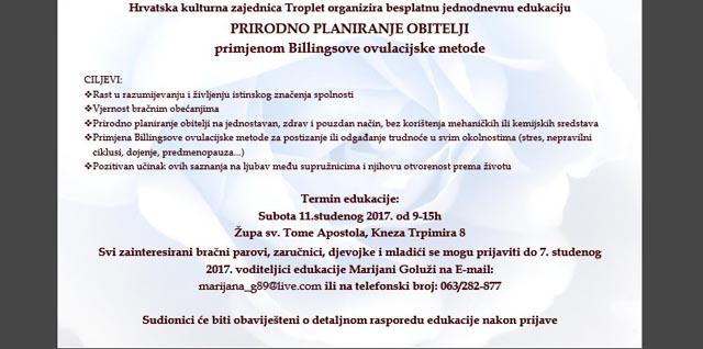... da upoznaju BILLINGSOVU OVULACIJSKU METODU kao i sve dobrobiti PRIRODNOG PLANIRANJA OBITELJI na besplatnoj jednodnevnoj edukaciji koja će se održati u subotu 11. studenog 2017. od 9-15h u župi sv. Tome Apostola, Kneza Trpimira 8.
