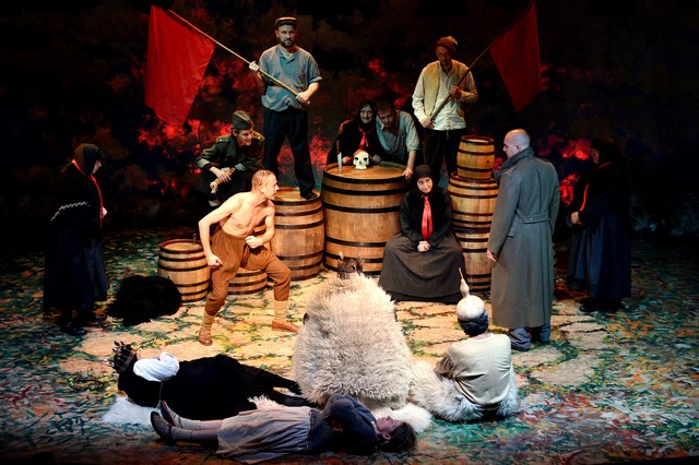 Mostarski „Hamlet" postavljen je na scenu ispunjenu bačvama raznih veličina, odnosno na veliko seosko gumno s nebom i oblacima u trećem planu. Prostor zapravo sugerira jednu veliku krčmu na otvorenom, donjomrdušku agoru, koja je i groteskni vlaški parlament i pozornica, s Brešanovim „Hamletom" kao jedinom točkom dnevnog reda. Sugerirajući prostor slobode ovakva scenska postavka postaje ironični komentar rigidnoga socijalističkog konteksta s početka pedesetih godina prošlog stoljeća. Istodobno, bačve na seoskom gumnu prizivaju davni svijet ritualnih svetkovina, dakle antički eksterijer, gdje se plesom, pjesmom i vinom slavio bog Dioniz.