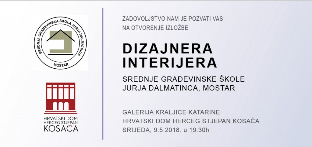...izložbe Dizajnera interijera Srednje građevinske škole Jurja Dalmatinca iz Mostara. Na smjeru DIZAJN INTERIJERA učenici se osposobljavaju za samostalno projektiranjei i izradu projektne dokumentacije pri uredjenju i dizajniranju interijera različitih namjena, kao naprimjer stambenog,poslovnog i zabavnog karaktera. Uključujući i dizajniranje dekorativno-funkcionalnih predmeta poput zrcala,lampi, satova i svih predmeta koji su u službi ugodnijeg i funkcionalnijeg unutrašnjeg prostora, učenici izrađuju unikatni namještaj učeći i propitujući različit dizajn i materijale koji daju specifičan i orginalan pečat u uređenju interijera.ž