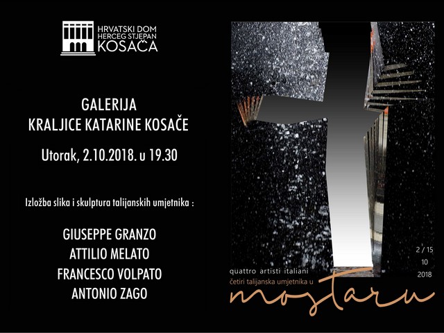 U utorak 2.listopada u velikoj izložbenoj dvorani Galerije kraljice Katarine s početkom u 19 i 30h održat će se izložba slika i skulptura četvorice talijanskih umjetnika iz regije Veneto. Autori su nakon kraćeg boravka u Mostaru inspirirani podnebljem Hercegovine izrazili želju za suradnjom i razmjenom umjetnika kako bi se Mostar i Veneto upoznali s trenutnim stanjem vizualnih umjetnosti ovih regija.