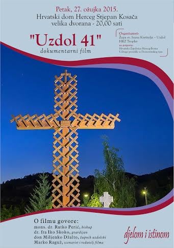 Film „Uzdol 41" govori o ratnom zločinu Armije BiH na Uzdolu na blagdan Uzvišenja svetoga Križa - 14. rujna 1993. Ujutro, toga dana pripadnici Armije BiH izvršili su stravičan pokolj nad 41 osobom, tamošnjim autohtonim stanovništvom Hrvatima (29 civila i 12 vojnika HVO-a). Najstarija ubijena osoba imala je 87 godina, najmlađa je bila desetogodišnje dijete, a mrtva tijela su masakrirana.
