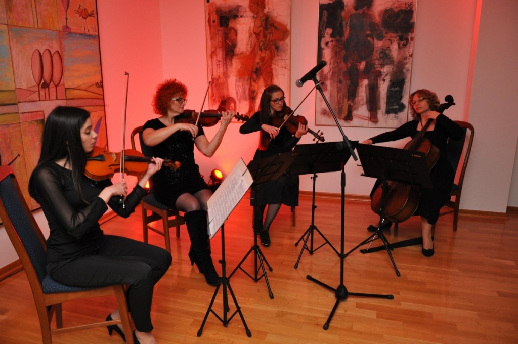 Posjetitelji su, po završetku protokolarnog dijela programa, pjenušcem nazdravili s članovima Uprave i Nadzornoga odbora Aluminija, a u razgledanju izložaka uživali su uz zvuke Mozartova Turskog marša i Boccherinijeva Menueta, u izvedbi spomenutoga Gudačkog kvarteta.