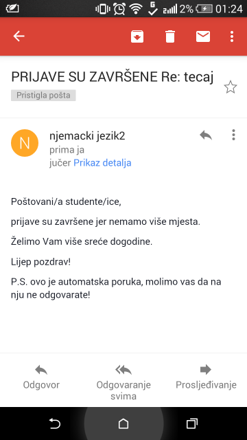 U tu svrhu prilažemo isječak iz maila koji se automatski vraćao svim studentima koji su se htjeli prijaviti na neki od navedenih tečajeva te su im vraćali poruke sa više sreće dogodine.