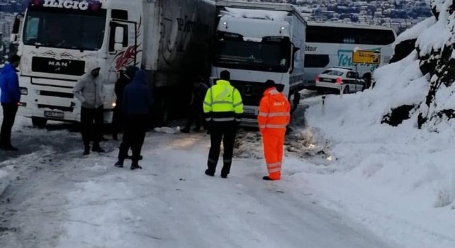 Snijeg i zimski uvjeti jutros su na kratko vrijeme zatvorili magistralnu cestu M-6.1 Mostar-Široki Brijeg na području Žovnice.
