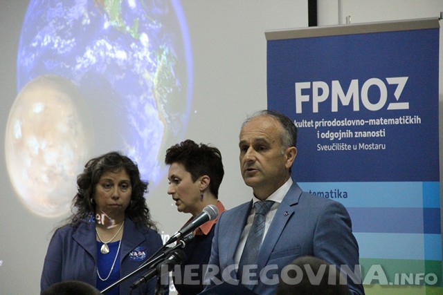 ...gospođu Nagin Cox (djelatnicu u NASA-i) koja će nam održati predavanje na temu Usudite se sanjati velike stvari: Putovanje na Mars. Zahvaljujemo gospođi Cox na dolasku na naš Fakultet prirodoslovno matematičkih i odgojnih znanosti i na naše Sveučilište u Mostaru, zahvaljujemo i američkom veleposlanstvu u BiH što je u sklopu svojih aktivnosti omogućilo svima nama zadovoljstvo upoznavanja s idejama na granici fantazije koje pokreću najveće umove čovječanstva i najsnažnije i najmoćnije svjetsko gospodarstvo.