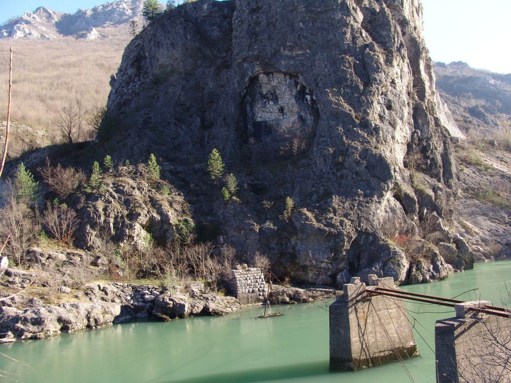 A volio bih fotografirati, ili makar pokušati dešifrirati njezin sadržaj, o čemu razmišljam otkako sam prvi put kročio s drugu stranu Ivan-planine. Vidim da to zapravo i nije ploča. Jednostavno je popeglan jedan dio stijene i na nj, na talijanskom jeziku!, uklesana zahvala slavnim graditeljima pruge. Možda su inženjeri bili Talijani, pa jedan od njih ostavio ovu vječnu uspomenu. Teško mi je dešifrirati, jer slova isklesana pretprošloga stoljeća su vlažna i ničim zaštićena, ali toliko mogu vidjeti i talijanski barem toliko razumijem, mada ipak ne odgonetam je li možda ta kamena posveta graditeljima ovoga mosta? Kada? Nigdje o njemu ne nađoh nikakva zapisa, ni o natpisu, što će reći da ništa od ovoga nije ni pod ikakvom zaštitom. Most sam samo jednom vidio u zdravom stanju. Nedavno; bio neki partizanski film, toliko star da je više bijel, nego crno-bijel! Partizani baš na ovom kamenom zubu, gdje je ova ploča. I uokolo. Napadaju ovdje rijeku. Po rijeci piče čamci, s mitraljezima na pramcu. Padaju Nijemci, padaju bome i partizani. Nasmočili se kaskaderi. Bože, gdje li je ona ljepota, kako ju nikada nisam vidio...sad skontam da se to baš tu snimalo. A, bome sam se i nasmijao: bilo je tu i čamaca gumenjaka, e, pa, nije mi jasno kako ispadaju iz njega mrtvi Nijemci, a nikako onaj čamac izdušit! Kao da ga nijedan metak iz brojne partizanske zasjede nije pogodio!