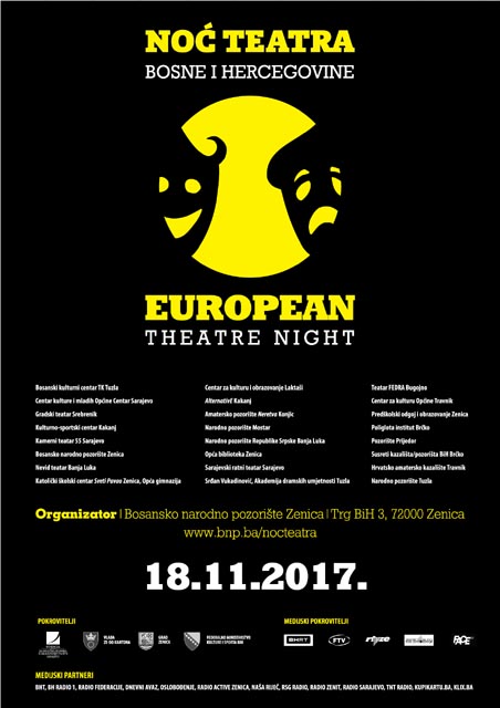 S ponosom najavljujemo i da je Narodno pozorište Mostar među sudionicima Europske manifestacije Noć teatra - Noć teatra Bosne i Hercegovine. U subotu, 18.11. u 20 sati u Narodnom pozorištu Mostar na repertoaru je predstava "Ćelava pjevačica" Eugènea Ionesca u režiji Lajle Kaikčija. U predstavi igraju Emir Sejfić (g. Smit) , Maja Zećo (gđa Smit), Emir Spahić (g. Martin), Dina Mušanović (gđa Martin), Andrea Aković (Meri) i Saša Oručević (vatrogasni kapetan). Ulaz besplatan!