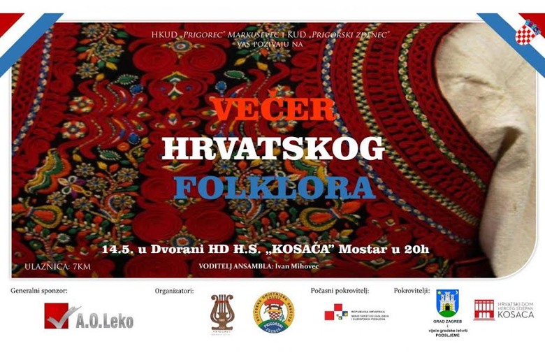Kulturna manifestacija "Večer hrvatskog folklora", na kojoj će nastupiti dva folklorna društva iz Zagreba, održat će se 14. svibnja 2016. u Hrvatskom domu hercega Stjepana Kosače, s početkom u 20 sati.