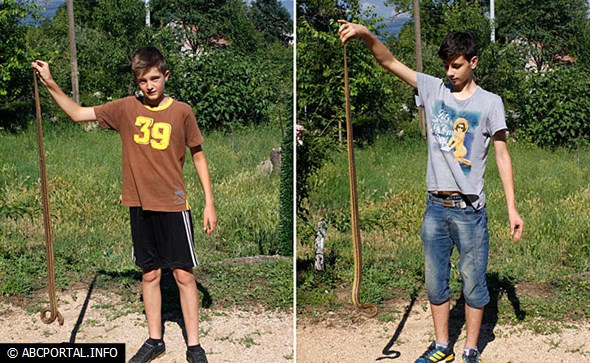 ...koja im služi za igru i zabavu nisu ni slutili da im je iza leđa zmija duga ravno 170 cm. Dečki su mislili da je zmijino šištanje, kad je osjetila opasnost, zapravo zvuk iz radio prijemnika pa nisu u početku pridavali puno pažnje tom. Naravno, ostali su iznenađeni kad im se iza leđa, iza zavjese pojavila zmijurina od ravno 170 cm, koja je bila jako uznimerina i ratoborna pa je borba dječaka i zmije potrajala pet šest minuta...