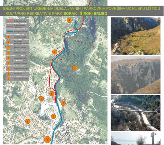 Prema idejnom projektu uređenja dijela javnih i parkovnih površina uz rijeku Lišticu - kulturno rekreativni park Borak - Široki Brijeg koji će realizacijom projekta "Adriatic canyoning" zasjati u punom sjaju, linija uređenja pokriva područje od izvora rijeke pa sve do gradskog bazena. Na skici se vidi i linija budućeg zip linea. Upravo je ovaj adrenalinski užitak povezivanja dviju strana danas u svijetu među najpopularnijima.