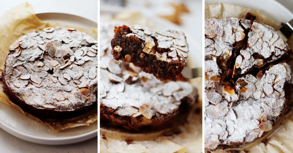 Najprije odvojite bjelanjke od žumanjaka. Bjelanjke istucite u snijeg. Žumanjke pomiješajte sa šećerom i izlupajte ih pjenjačom. Dodajte sol. Čokoladu i maslac otopite na pari ili u mikrovalnoj pećnici. Kratko ohladite pa ih umiješajte u jaja i šećer. Dodajte alkohol po želji i sve dobro sjedinite. Dodajte mljevene i sitno nasjeckane bademe. Ponovno promiješajte pa laganim pokretima umiješajte tučene bjelanjke. Prebacite sve u kalup koji ste premazali maslacem i obložili papirom za pečenje. Pospite listićima badema i pecite od 45 do 50 minuta na 180 stupnjeva. Nakon prvih 15 minuta provjerite, ako su vam listići badema previše potamnili, prekrijte kolač folijom i nastavite ga peći.