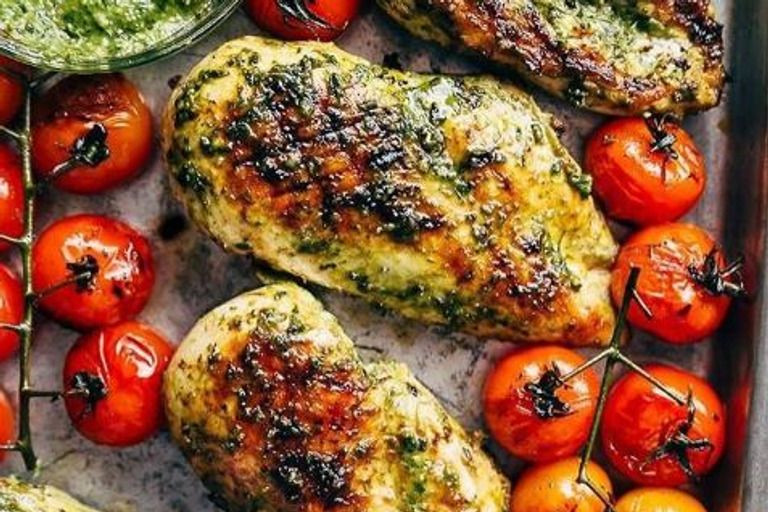 Zagrijte grill, grill tavu ili običnu tavu na srednje jakoj vatri. Pecite piletinu sa svake strane 5 do 6 minuta. Prebacite na zagrijani tanjur. Popržite rajčice dok ne omekšaju i poprime smeđu boju. Nadjenite piletinu s još malo pesta i poslužite s rajčicama.