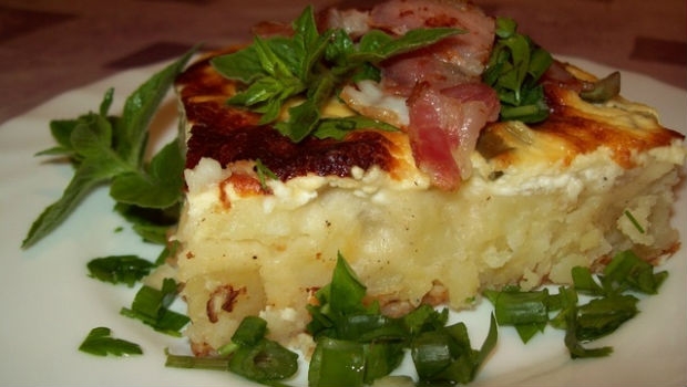 U zagrijani lim veličine pećnice stavite malo ulja i na to tijesto. Na tijesto se odmah stavi smjesa od krumpira i luka, a onda se to pokapa sa sviježim kravljim sirom.