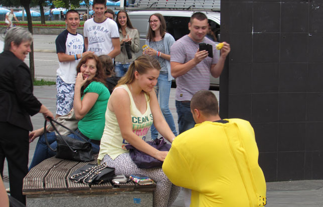 Kaže da su svi bili u čudu, a djevojka najviše. Kada je izgovorila ``da``, uslijedio je poljubac i gromoglasni aplauz prijatelja i prolaznika.