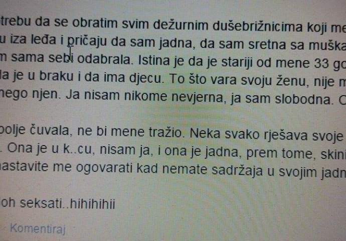 Da ga je bolje čuvala, ne bi mene tražio. Neka svako rješava svoje probleme. Ona je u k..cu, nisam ja, i ona je jadna, prem tome, skinite mi se s grčabe i nastavite me ogovarati kad nemate sadržaja u svojim jadnim životima.