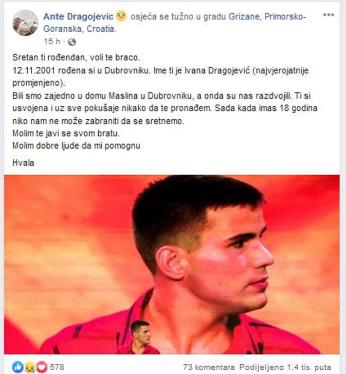 - 12.11.2001 rođena si u Dubrovniku. Ime ti je Ivana Dragojević (najvjerojatnije promijenjeno). Bili smo zajedno u domu Maslina u Dubrovniku, a onda su nas razdvojili. Ti si usvojena i uz sve pokušaje nikako da te pronađem. Sada kada imaš 18 godina nitko nam ne može zabraniti da se sretnemo. Molim te javi se svom bratu - napisao je Ante i zamolio dobre ljude za pomoć. Mnogi su odmah nudili savjete za pomoć u komentarima, a njegova je objava u manje od 24 sata podijeljena više do 1500 puta na Facebooku.