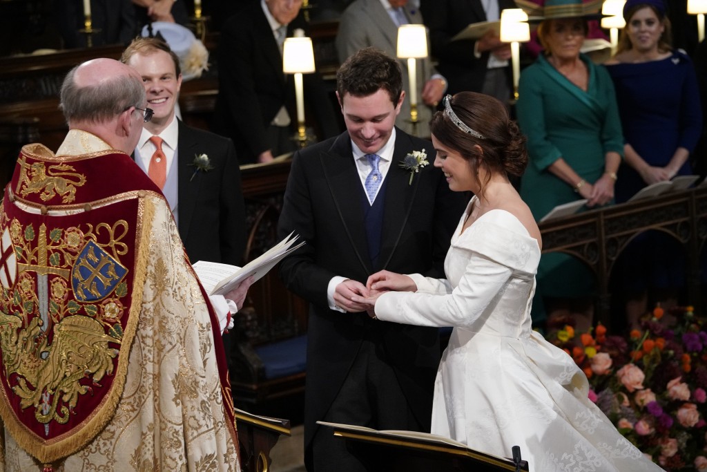 Vjenčanicu koju je nosila Eugenie dizajnirali su Peter Pilotto i Christopher De Vos s otvorenim leđima kako bi se vidjeli ožiljci od operacije iz djetinjstva. Do oltara ju je dopratio otac princ Andrew.