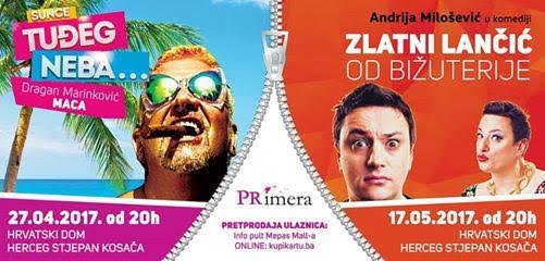 Osim ove hit komedije agencija PRimera priprema još jednu- monodramu poznatog glumca Andrije Miloševića "Zlatni lančić od bižuterije", koja će u dvorani Kosače biti izvedena 17. svibnja.