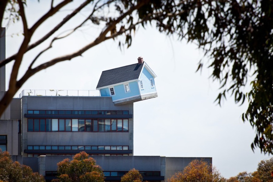 Zgrada sveučilišta u američkom San Diegu dobila je prije dvije godine zanimljiv i neobičan dodatak. Riječ je o plavoj kućici koja izgleda kao da je sletjela s neba i pala na rub glavne zgrade.