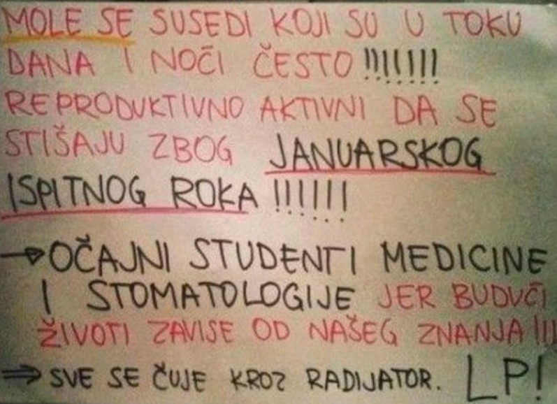 'Mole se susjedi koji su tijekom dana i noći često reproduktivno aktivni da se stišaju zbog siječanjskih ispitnih rokova. Očajni studenti medicine i stomatologije jer budući životi ovise o našem znanju! Sve se čuje kroz radijatore! LP', stoji u poruci.
