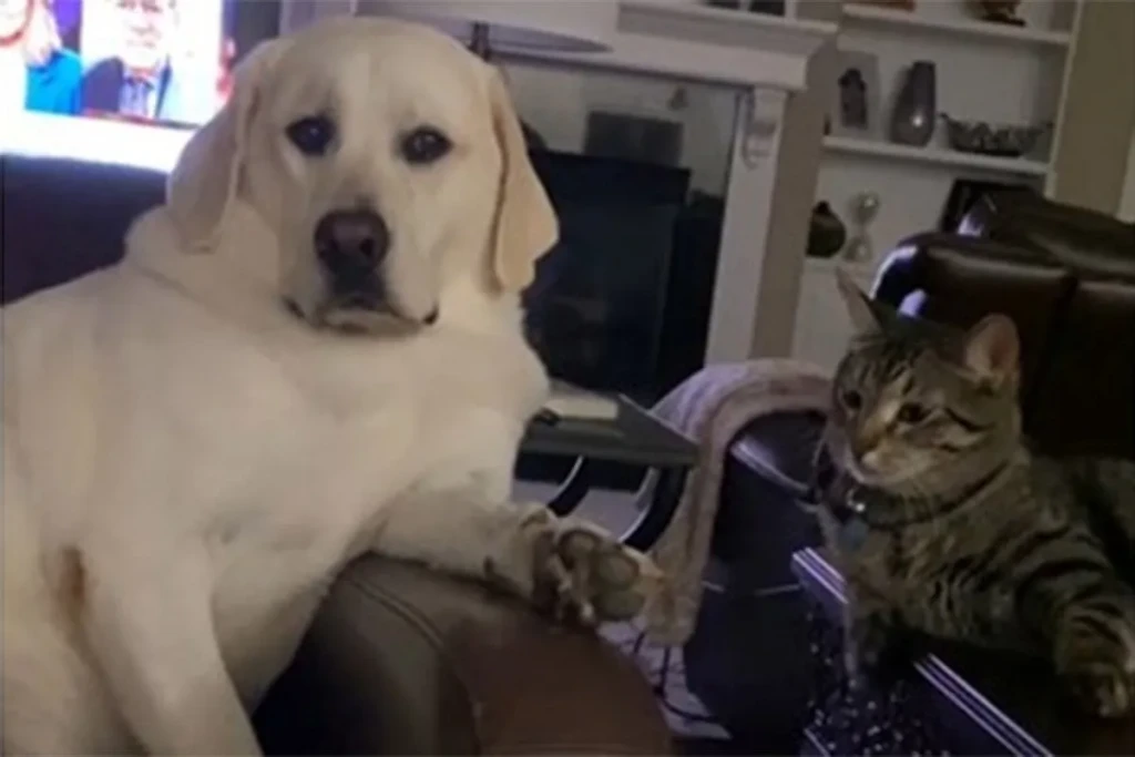 Na videu koji je pregledan 2.8 milijuna puta, možemo vidjeti kako labrador opušteno sjedi u kožnoj fotelji, dok mačak leži na stolu do njega.