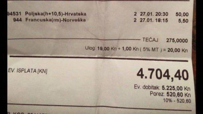 Ukupan tečaj na okladu je bio ogromnih 275, a nepoznati sretnik je uložio ‘samo' 20 kuna i tako na kraju večeri u džep pospremio 4.704 kune.