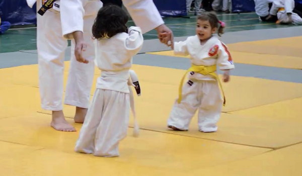 Slažemo se da su skoro prohodale ali odmah su disciplinirano prihvatile sve obveze i pravila borilačkih vještina, a kako bi to ispustile kad je prva nagrada velika čokolada sa rižom ...
