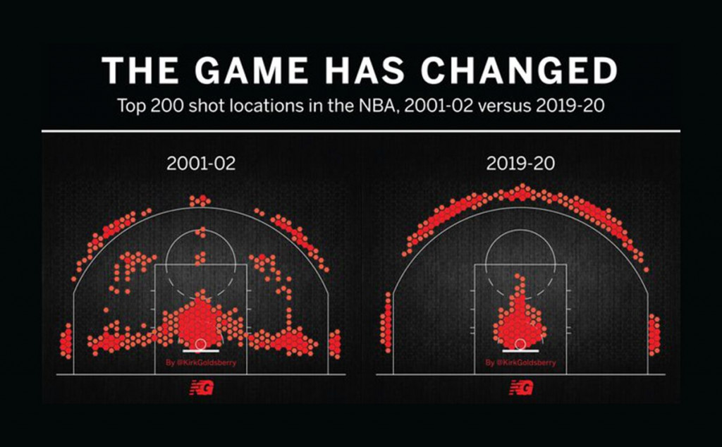 "The game has changed", kratko i jasno poručio je na svom službenom Twitter profilu uz sliku koja prikazuje 200 najčešćih lokacija s kojih su upućeni šutevi u dva razdoblja - sezona 2001-2002 te sezona 2019-2020.