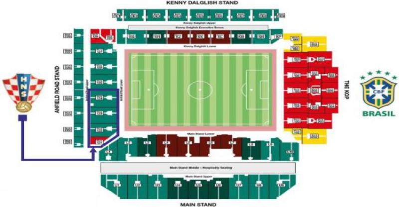 Hrvatskim navijačima preporučuje se kupiti ulaznice na tribini 'Anfield Road' (počevši sa sektorima 121 - 124), a brazilskim navijačima na tribini 'Kop'.