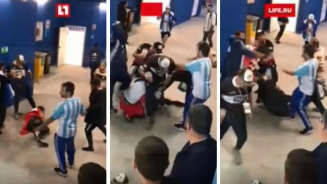 Na snimku koji je objavio ruski portal Life.ru vidi se kako Argentinci cipelare hrvatskog navijača, a mladića koji je ležao na podu udaraju nogom u glavu.