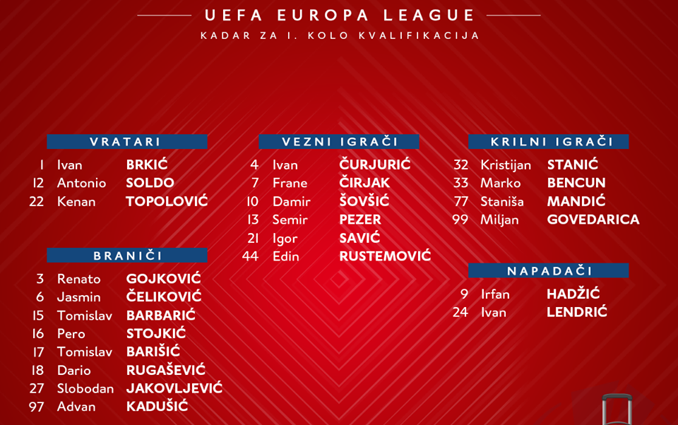 HŠK Zrinjski: Popis igrača za 1. kolo kvalifikacija UEFA Europa lige