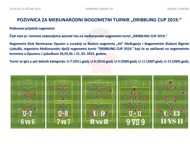 Međunarodni dječji nogometni turnir Dribbling Cup 2019. održat će se na nogometnim terenima u Opuzenu, Međugorju i Ljubuškom od 28. do 31. ožujka 2019. godine.