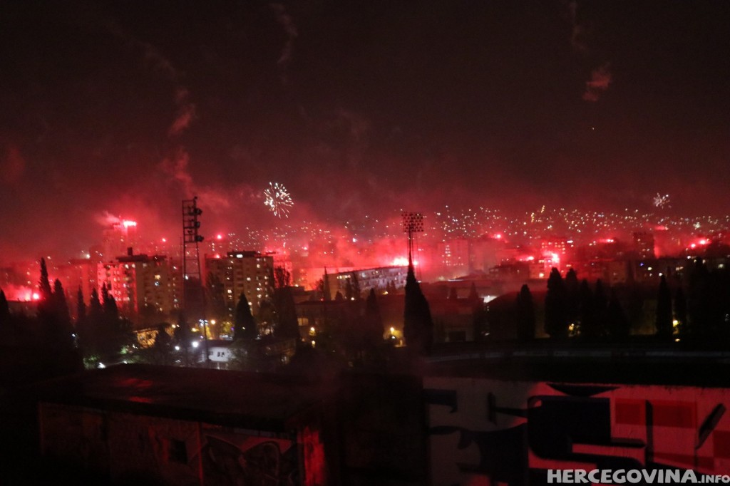 Mostar je večeras doslovno gorio i Ultrasi su pretvorili noć u dan tako što su upalili nekoliko stotina baklji na vrhovima svih većih zgrada u gradu. A sve je to popraćeno vatrometom.