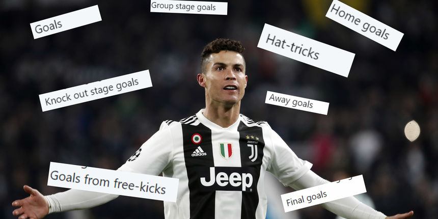 Svi statistički podaci vezani uz Ronalda i najelitnije europsko nogometno natjecanje jednostavno su neumoljivi. Portugalac je vodeći u sljedećim kategorijama: golovi, golovi na domaćem travnjaku, golovi na gostujućem travnjaku, golovi u grupnoj i nokaut fazi natjecanja, golovi u finalima, golovi iz slobodnih udaraca i jedanaesteraca, golovi glavom. Vodeći je i po broju asistencija, te po količini postignutih hat-trickova, kao i situacija kada je bio dvostruki strijelac.