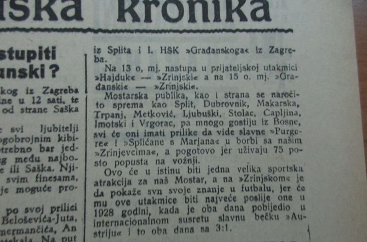 U to doba Mostar je u odnosu na Beč predstavljao mali grad iz provincije u komu je prema popisu obitavalo 18.038 stanovnika raspoređenih u 4.631 domaćinstava. Od mostarskih klubova odabran je HŠK Zrinjski koji je trebao poslužiti kao sparing partner FC Austriji za predstojeću turneju po našim prostorima. Očito su Bečani odlučili malo odmoriti od dugotrajnog putovanja željeznicom, uživati u čarima Mostara i usput kalibrirati nišanske sprave puneći mrežu njima tada nepoznatog, amaterskog kluba. Zasigurno su se iznenadili kada je Zrinjski ostvario pobjedu te su tražili da se sutra odigra revanš. Plemići su ponudu rado prihvatili i opet istim rezultatom 3:1 isprašili Bečane. A bila je to borba Davida i Golijata. Kakve su okolnosti tada bile navesti ćemo kroz jedan primjer. U to doba zbog oskudne financijske situacije nogometaši Zrinjskog uglavnom su bili prinuđeni u vlastitoj režiji nabavljati sportsku opremu. Kada bi se nekako teškom mukom nabavile kopačke čuvale bi se kao suho zlato. Igrači su često navodili da kada bi išli na utakmicu u Čapljinu protiv ŠK Uskok izlazili bi na željezničkoj postaji u gradu, a potom pješice po neasfaltiranom putu prema stadionu. Kako se ne bi oštetili i polomili kramponi kopačke bi se skidale s nogu, dok bi nogometaši nastavili bosi po oštro izlomljenom kamenju. S druge strane možemo samo pretpostaviti kakve su uvjete imali igrači Austrije. I pored toga, Bečani su osjetili snagu i kvalitetu HŠK Zrinjski. Stoga, premda su statistika i svi ostali nogometni parametri na strani gostiju iz Nizozemske nadamo se da će Zrinjski opet svladati Golijata te ispisati novu stranicu povijesti našeg najuspješnijeg kluba! Neka traje!