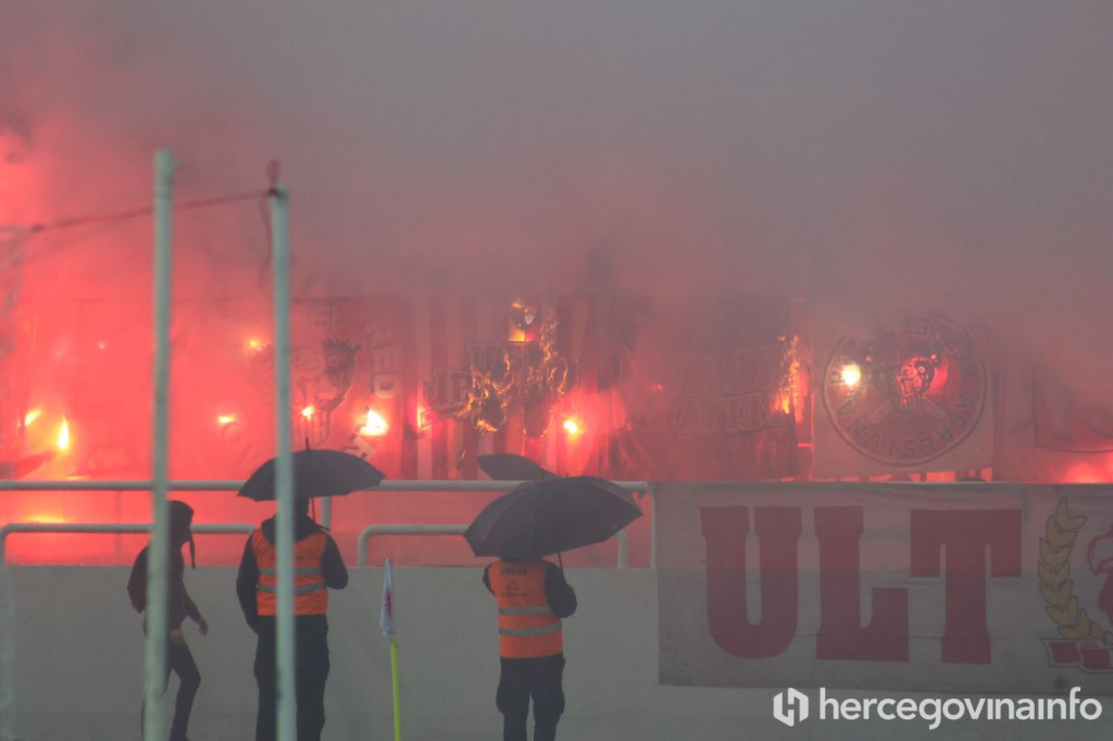 Tijekom današnjeg gradskog derbija između Zrinjskog i Veleža koji se danas igra na stadionu 'HŠK Zrinjski', navijači Zrinjskog Ultrasi zapalili su brojne transparente svojih navijačkih rivala.