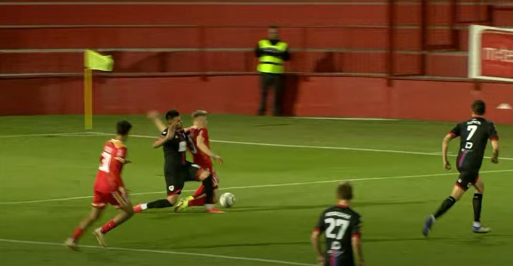 Drugi sporni trenutak koji je izazvao buru negodovanja na stadionu dogodio se tri minute kasnije. U duelu su bili stoper Veleža Tarik Isić i grčki napadač Moraitis. Topalović je dosudio slobodni udarac iz kojeg je pao pogodak. Domaći su smatrali da je on dosuđen prestrogo.
