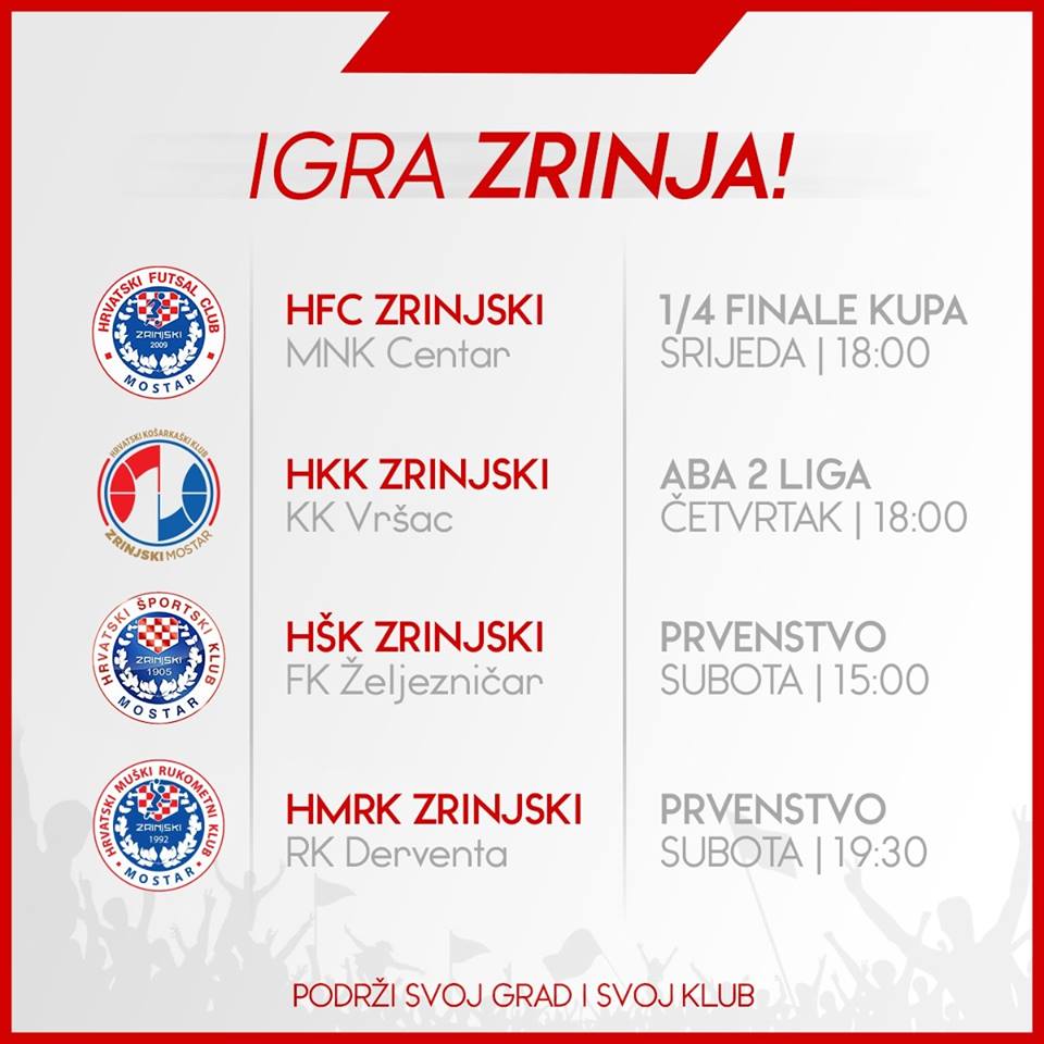 Pozivaju se svi navijači, simpatizeri i prijatelji obitelji Zrinjski, ali i svi ljubitelji sporta u gradu Mostaru da podrže svoje kolektive u ovom velikom sportskom tjednu. Podrži svoj klub i svoj grad.
