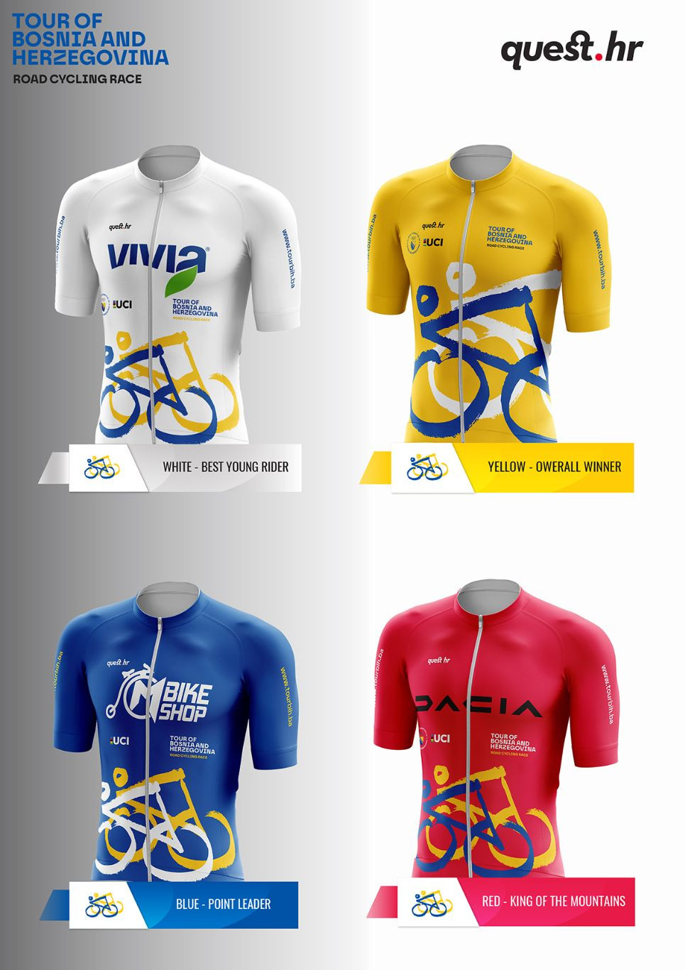 Poput legendarnih majica na Tour de Franceu ili Giru d’Italia, i Tour of Bosnia and Herzegovina ima svoje prepoznatljive dresove koji izdvajaju najbolje vozače u pojedinim kategorijama. Dresove za ovu utrku osigurao je brend QUEST HR, poznat po sportskoj opremi koja spaja funkcionalnost, udobnost i suvremeni dizajn.