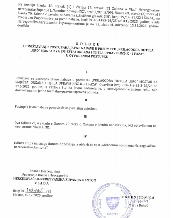 Vlada Hercegovačko-neretvanske županije poništila je postupak javne nabave za projekt „Prilagodba hotela ‘Ero’ Mostar za smještaj organa i tijela uprave HNŽ-a – I faza“, proizlazi iz odluke donesene na 55. sjednici Vlade HNŽ-a, održanoj 15. prosinca 2025. godine.
