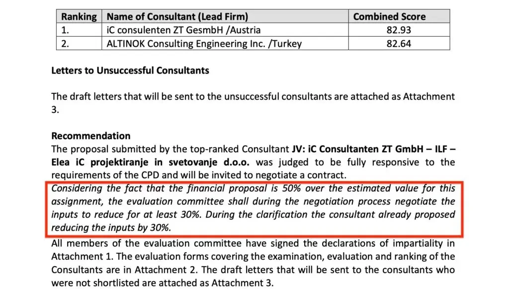 Evaluacijska komisija upozorila je kako je cijena izabrane ponude 50 % viša od procijenjene vrijednosti te predložila korekciju od najmanje 30 %. Unatoč tome, Autoceste su nastavile postupak i prijedlog ugovora poslale EBRD-u.