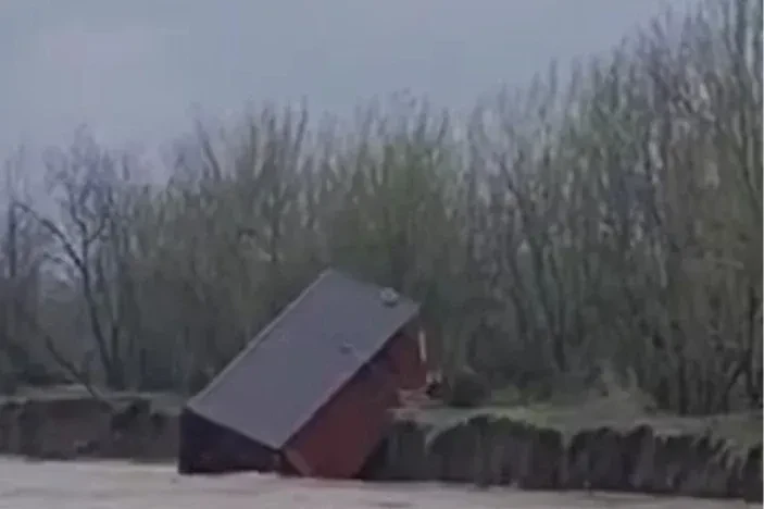 Može se vidjeti kako rijeka Bosna "nosi" jednu od lokalnih vikendica.