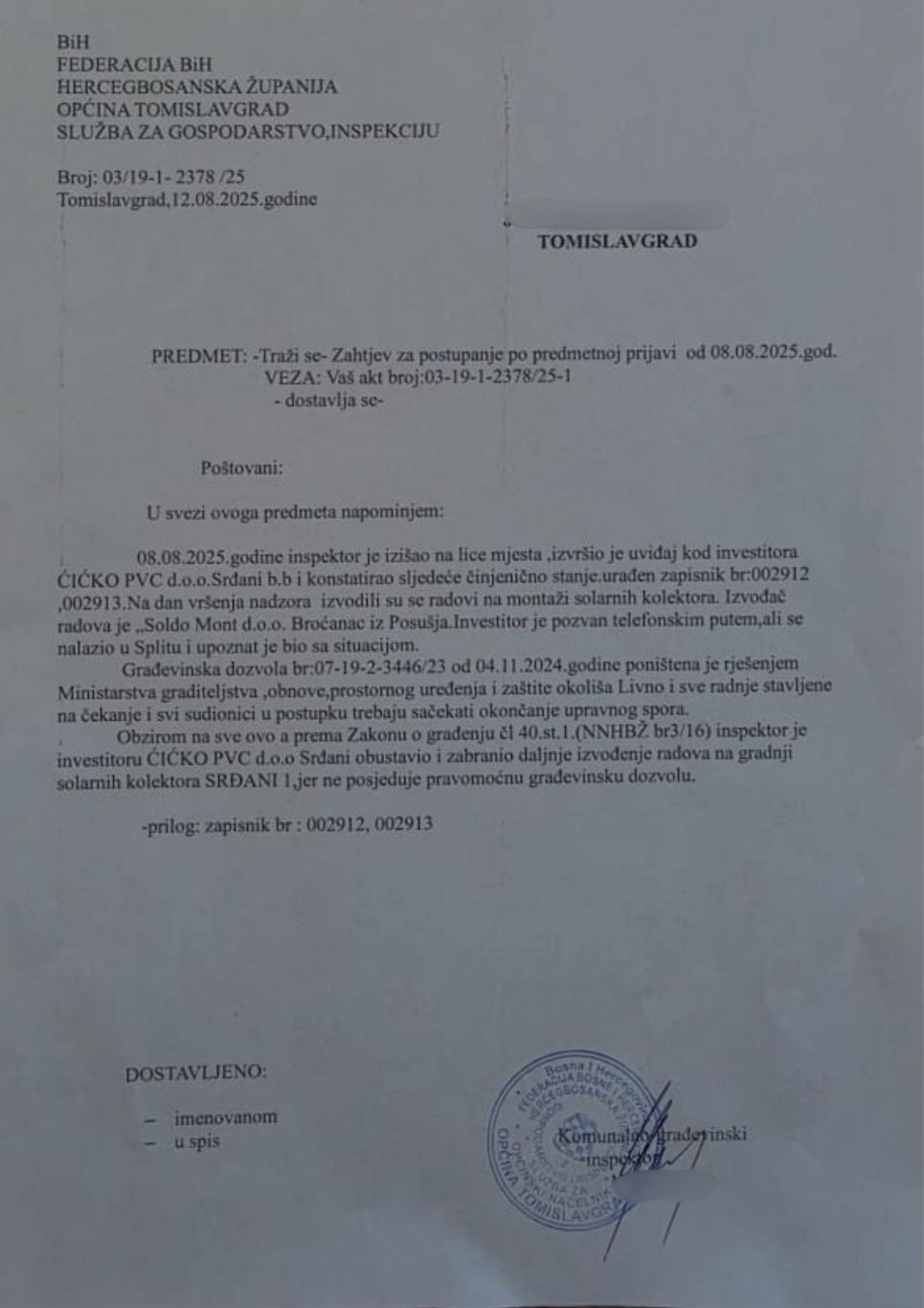 Općina Tomislavgrad u studenom 2024. izdaje građevinsku dozvolu, iz postupka potpuno isključivši susjede. Ministarstvo graditeljstva HBŽ-a u srpnju 2025. proglasilo je tu dozvolu ništavnom, ali je investitor nastavio radove još tjednima.