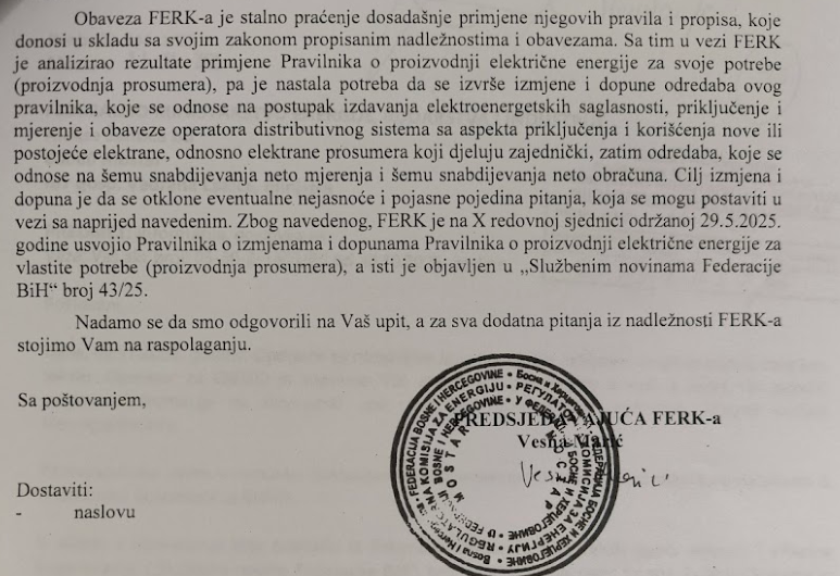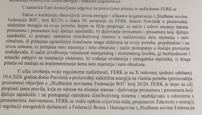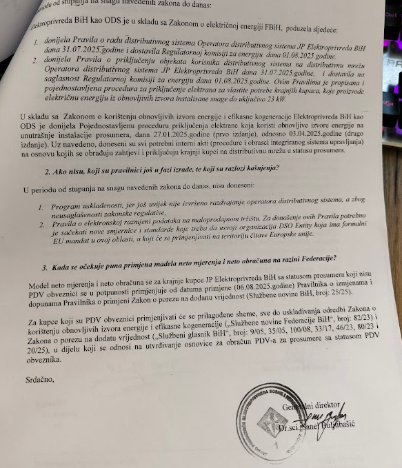 Elektroprivreda BiH u svom očitovanju dodatno navodi da pojednostavljene procedure za priključenje prosumera postoje kao zakonska obveza, ali da “nije definiran rok kada isto treba propisati”, čime je potvrđen pravni vakuum koji je godinama kočio građansku energiju.