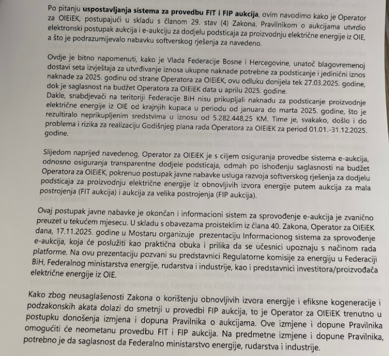 Međutim, iz odgovora Federalnog ministarstva energije, rudarstva i industrije proizlazi da u trenutku donošenja zakona nisu bili spremni podzakonski akti nužni za njihovu primjenu. Pravilnici su donošenI postupno tijekom 2024. i 2025. godine, dok se puni mehanizmi, uključujući sustav aukcija, planiraju u primjeni tek tijekom 2026. godine.