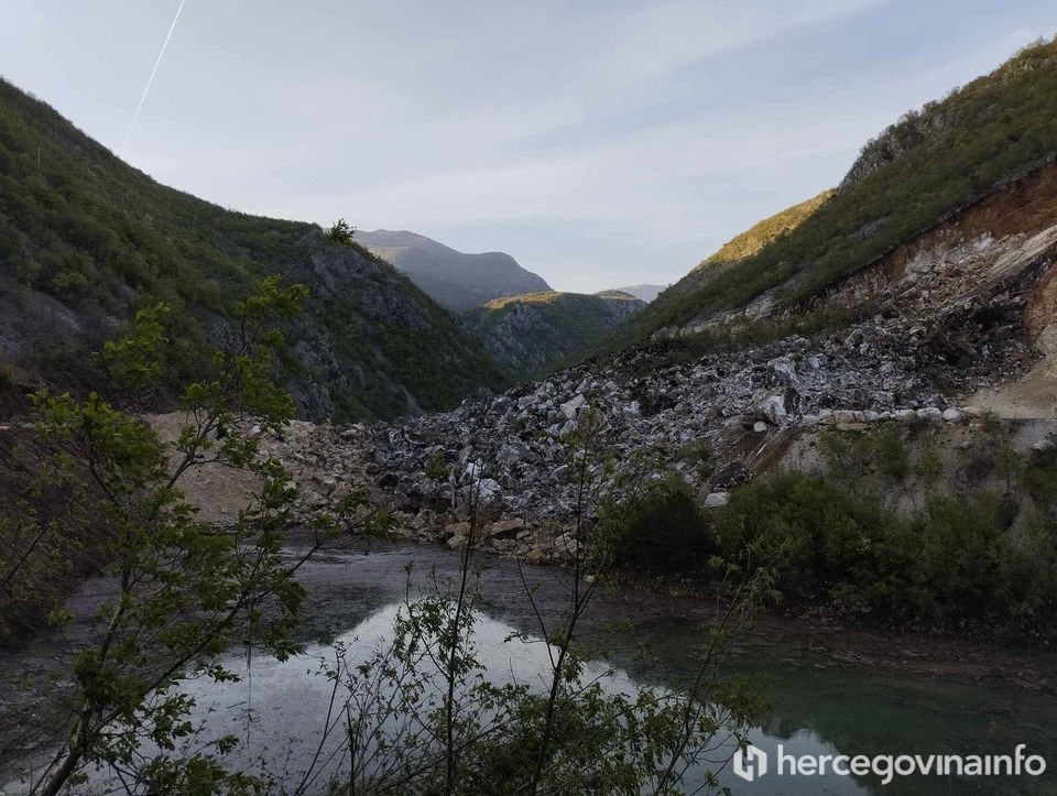 Nakon miniranja kamenoloma na području 'Bijela' u sjevernom dijelu mostarske općine nastao je veliki odron koji je u Neretvu odnio dva automobila, a sumnja se da je još jedan automobil pod urušenim kamenolom ili također u vodi.