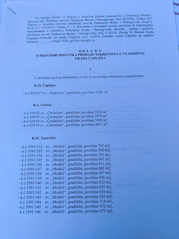 U Čapljini se ponovno otvara pitanje transparentnosti u upravljanju gradskim zemljištem nakon što su u javnost dospjeli dokumenti koji ukazuju na moguće nepravilnosti u postupku prodaje parcela u naselju Modrič (K.O. Tasovići).