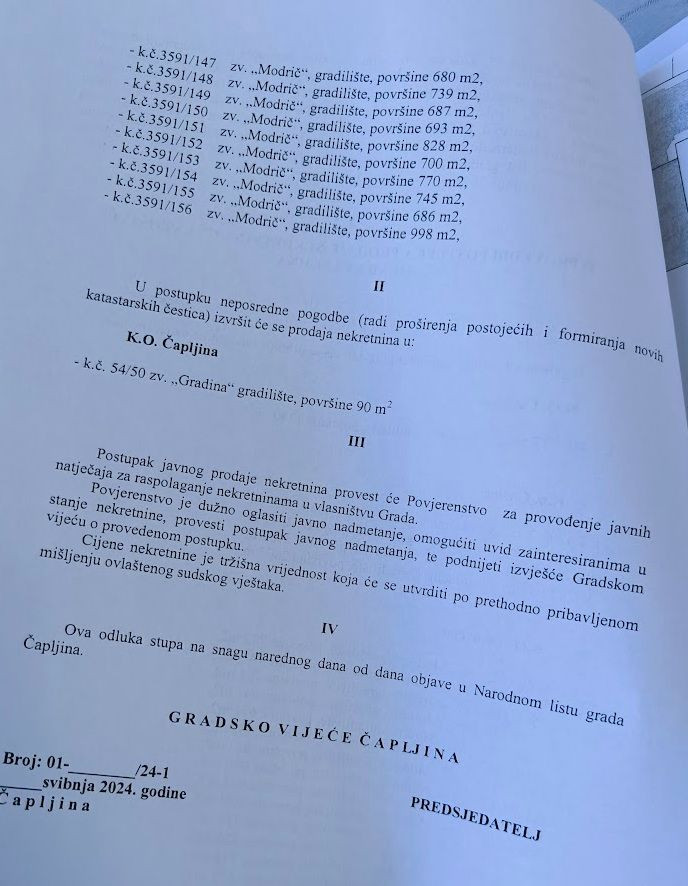 Odluka, objavljena u Narodnom listu Grada Čapljine, obuhvatila je 25 građevinskih parcela, među njima i onu označenu kao k.č. 3591/147, zv. „Modrič“, površine 680 m².